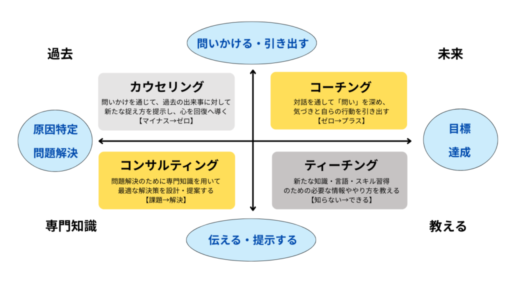 私たちは、状況や目的に応じてティーチング・コーチング・カウンセリング・コンサルティングを使い分け、人と組織の成長を総合的に支援します。